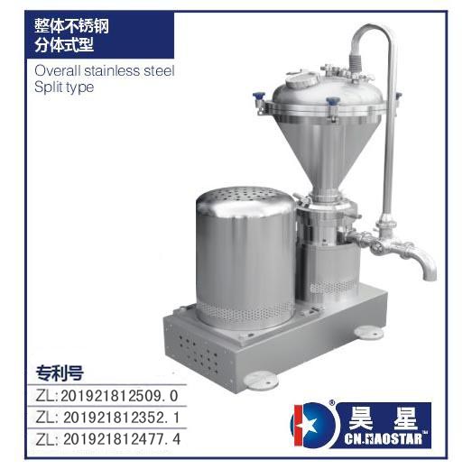 昊星分體式封閉式膠體磨colloidmill-jiaotimo配立式電動機,機體與電機連體同軸結構,故又稱傍立式膠體磨,并采取全封閉式內循環構造。